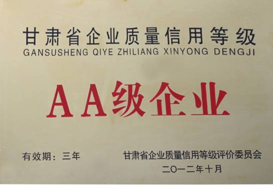 公司被評(píng)為2012年度甘肅省企業(yè)質(zhì)量信用等級(jí)AA級(jí)企業(yè)