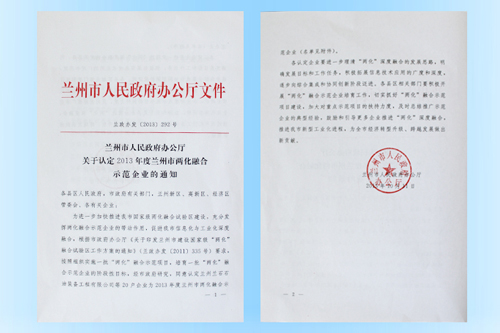 2014年12月5日,蘭州市兩化融合現場會在中林賓館召開,我公司被認定為2013年度蘭州市兩化融合示范企業。