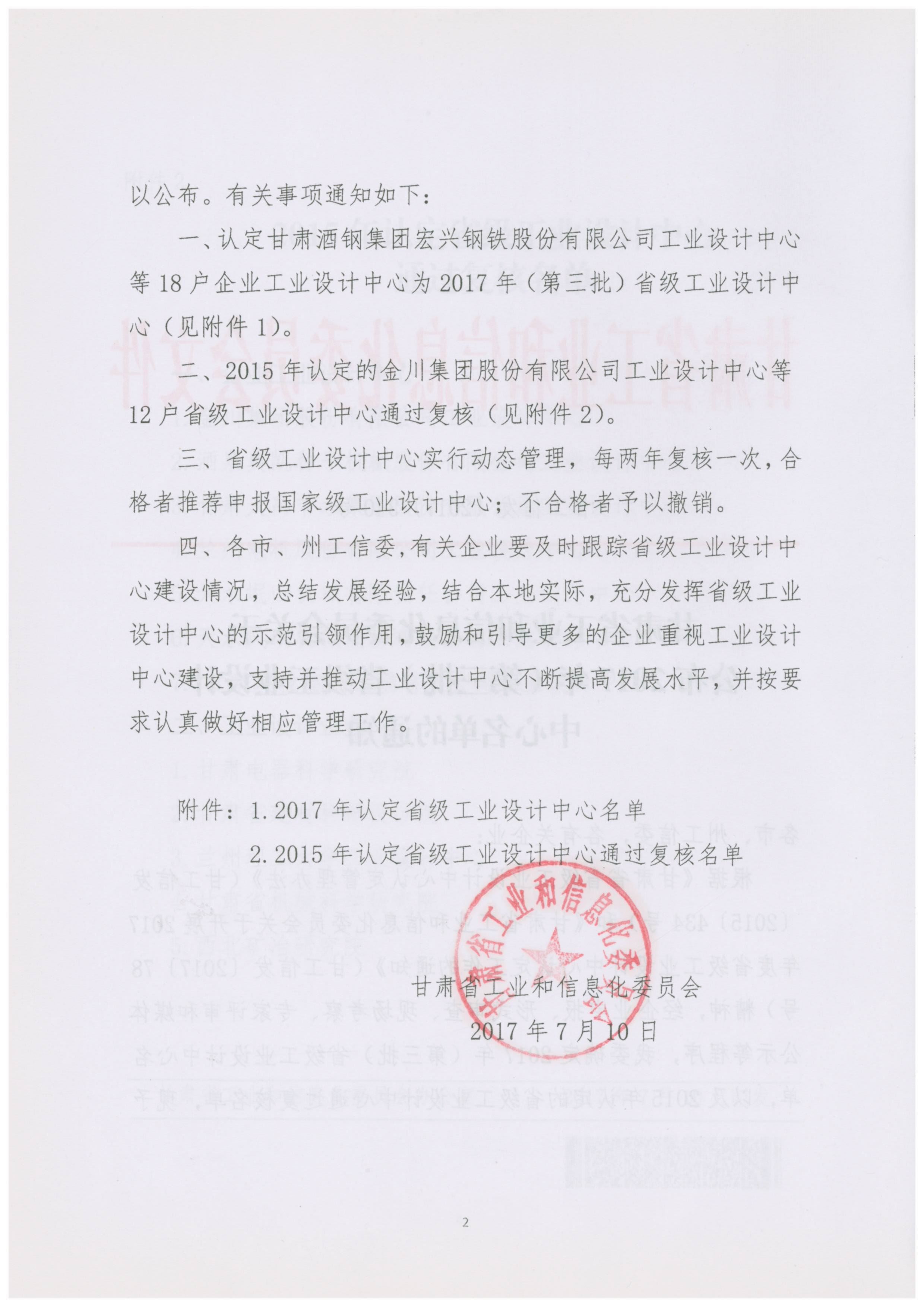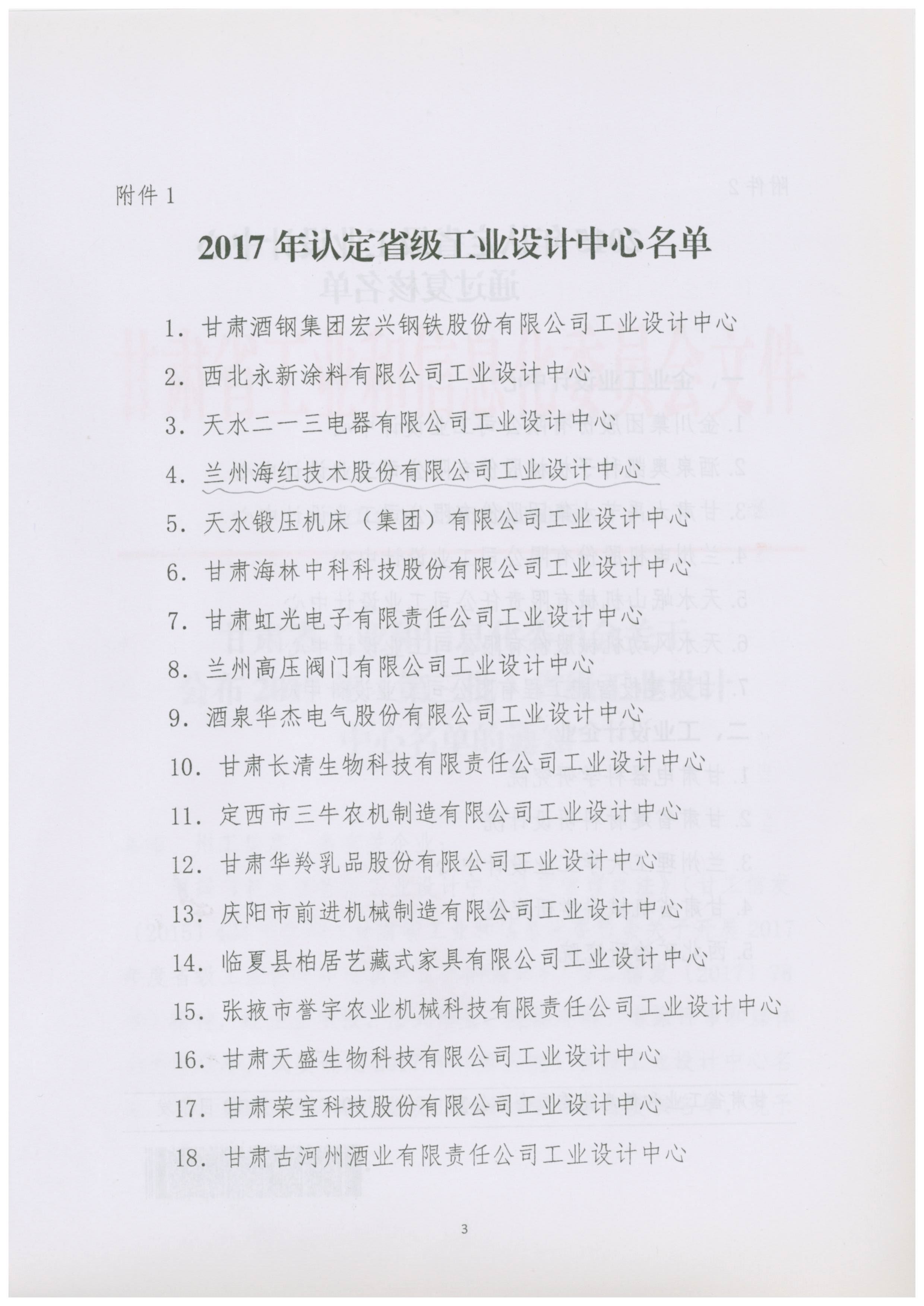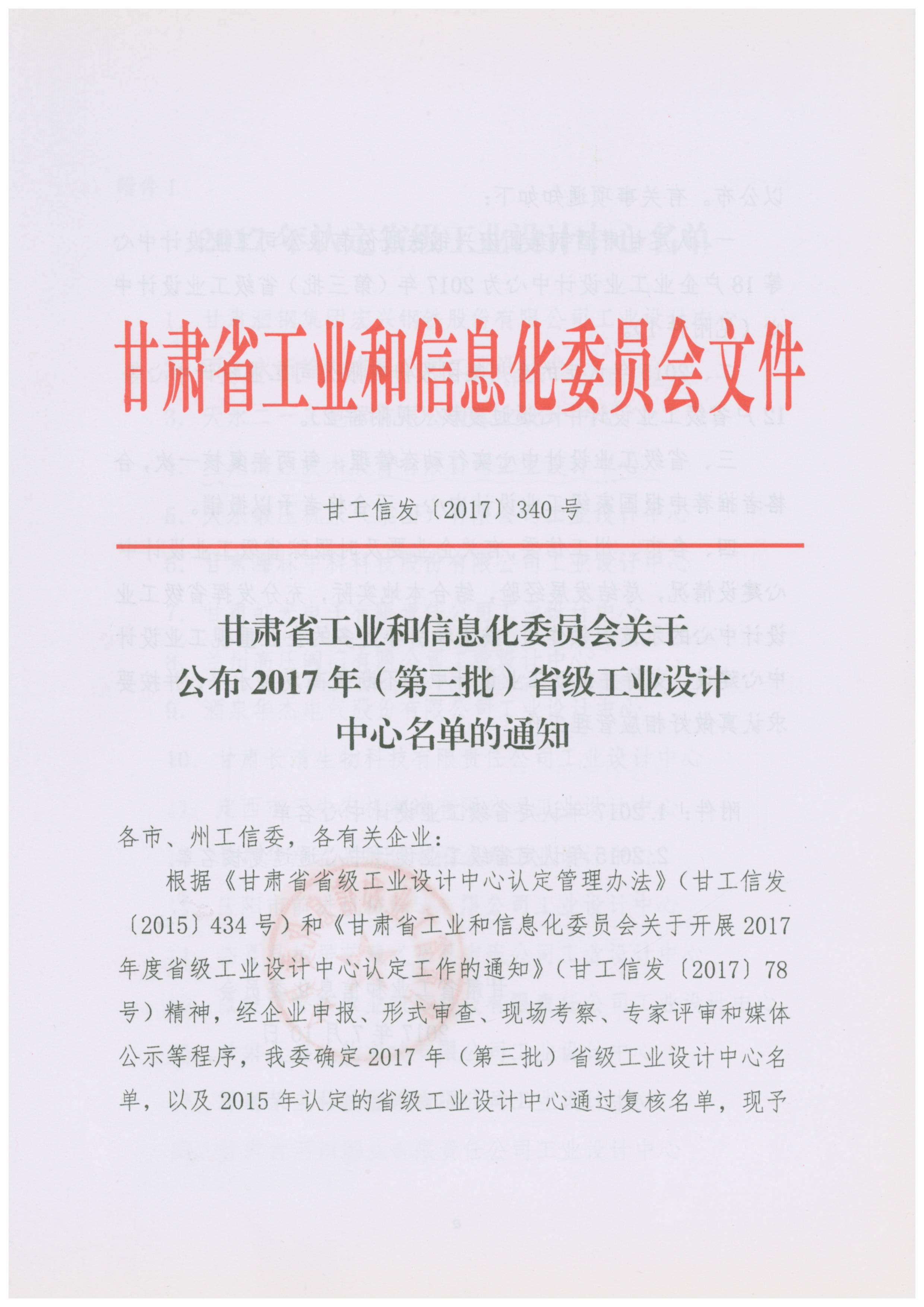 我公司設計中心被省工信委認定為2017年(第三批)“省級工業設計中心”[《關于公布2017年(第三批)省級工業設計中心名單的通知》(甘工信發〔2017〕340號)文件],這是對我司工業設計能力和創新能力的充分肯定,同時獲得50萬元的中心建設政府補貼資金。