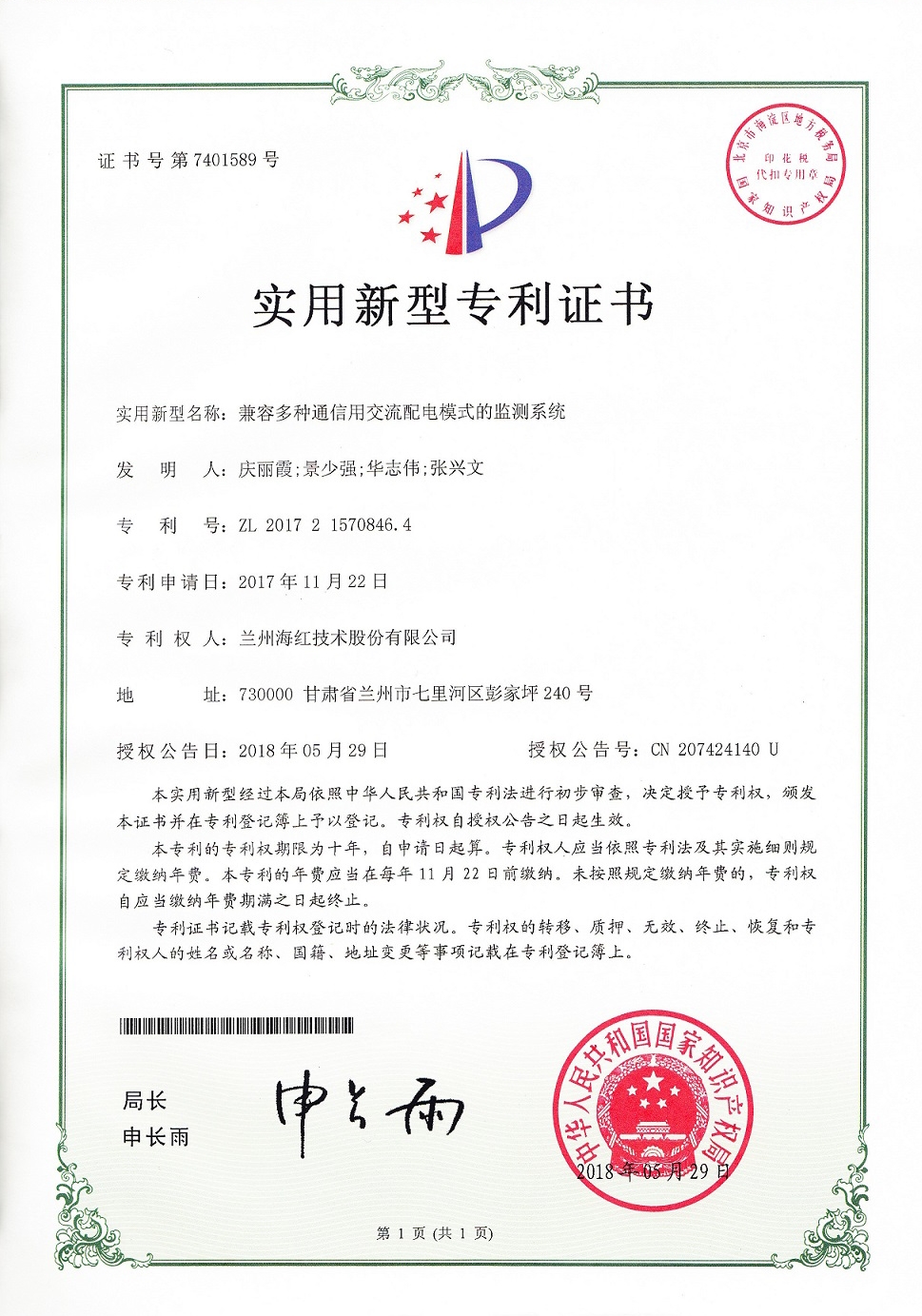 我公司又取得四項實用新型專利,至此我公司申請受理的專利數累積84項(其中發明專利17項,實用新型專利56項,外觀設計專利3項,軟件著作權8項),已獲得授權59項(其中發明專利8項,實用新型專利40項,軟件著作權登記8項,外觀設計專利3項)。