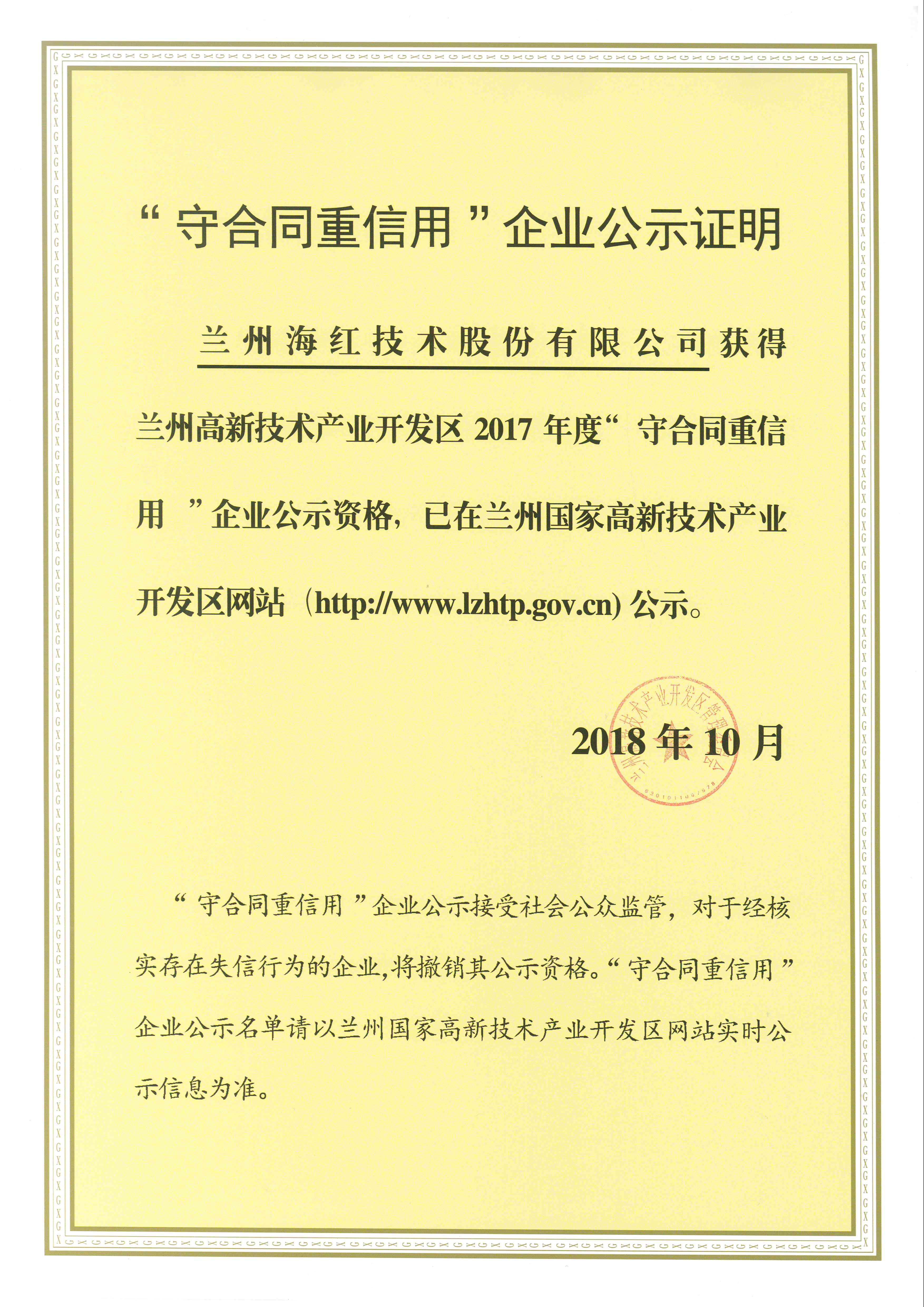 我公司榮獲2017年度蘭州市/高新區“守合同、 重信用”企業榮譽稱號 By 海紅技術 2018-11-29 00:00:00 0次 我公司被蘭州市工商行政管理局和蘭州市高新技術產業開發區管理委員評定為2017年度“守合同、重信用”企業。 上一篇:我司與蘭州交通大學新能源與動力工程學院共建“新能源汽車充電技術聯合研究中心”暨設立“海紅獎學金” 下一篇:我公司又取得二項實用新型專利