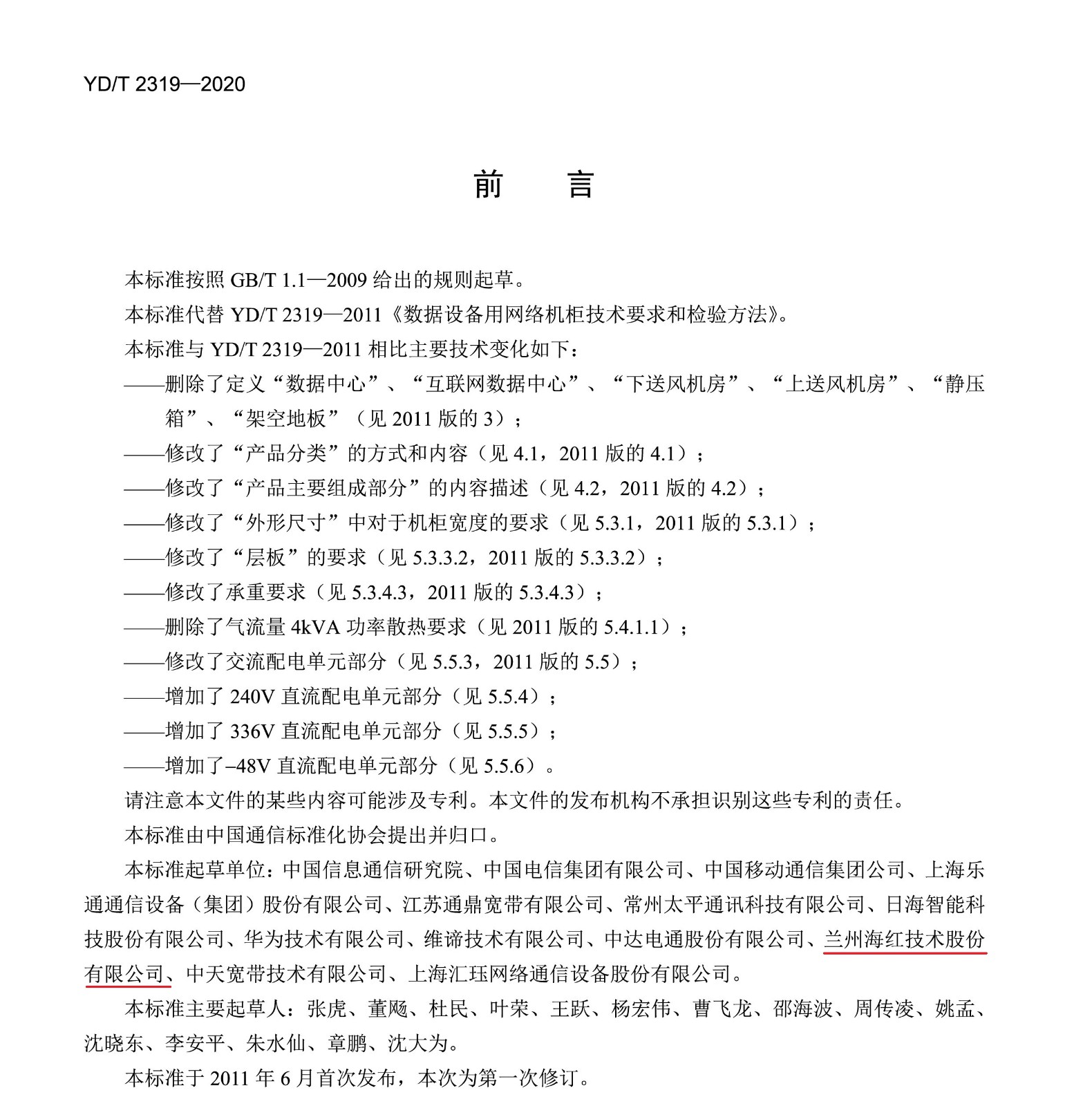 我司參與起草的行業標準《數據設備用網絡機柜》(YD/T 2319-2020)經中華人民共和國工業和信息化部批準發布,已于2021年01月01日實施。以上標準是繼《通信局(站)電源系統總技術要求》、《通信電源和機房環境節能技術指南 第2部分:應用條件》、《通信電源和機房環境節能技術指南第5部分:氣流組織》、《通信局(站)電源系統維護技術要求第 8 部分:動力環境監控系統》、《網絡機柜用分布式電源系統》、《通信機房用光纖槽道》、《通信用240V直流供電系統使用技術要求》、《通信用240V/336V直流配電單元》、《通信基站基礎設施技術要求 第1部分:總則》、《通信基站基礎設施技術要求 第2部分:供電系統》、《通信基站基礎設施技術要求 第3部分:溫控系統》、《通信基站基礎設施技術要求第 4 部分:監控系統》、《通信基站梯次利用車用動力電池的技術要求與試驗方法第 1 部分:磷酸鐵鋰電池》、《數據中心用市電加保障電源的兩路供電系統技術要求》、《通信基站基礎設施技術要求第5部分:室內微模塊》十五項標準之后,由我司參與起草、修訂正式出版的第16項行業標準。