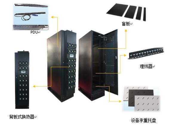 背板式溫控設備是由背板式換熱器、柜體、PDU(電源分配單元)、盲板、理線器和承重托盤等配件組成。