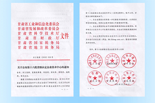 根據《甘肅省企業技術中心認定與評價辦法》,甘肅省工業和信息化委員會會同甘肅省發展和改革委員會、甘肅省科學技術廳、甘肅省財政廳、甘肅省國家稅務局和甘肅省地方稅務局等6部門聯合審定,我公司技術中心被認定為省級企業技術中心。